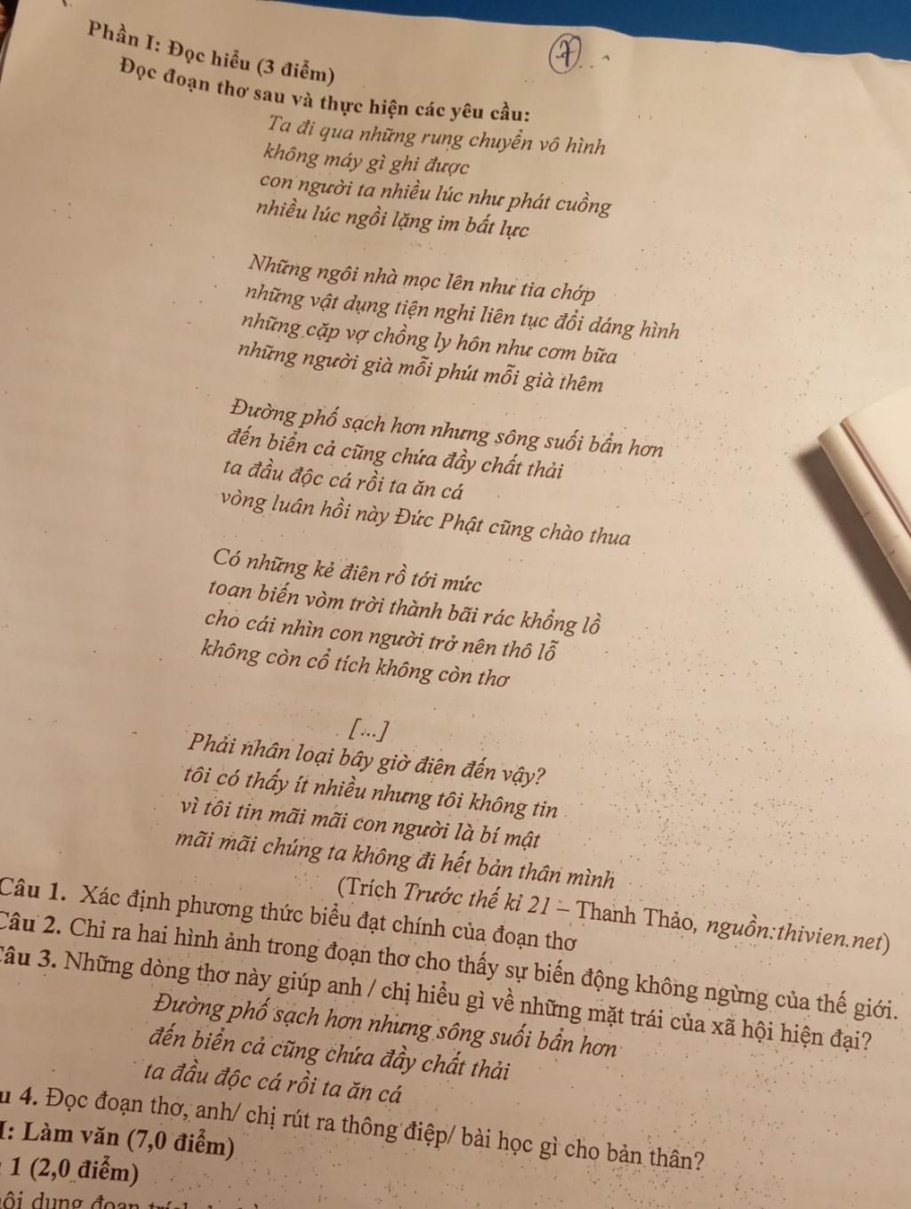 Câu 4 ; Qua đoạn thơ trên em thấy trái đất dần thay đổi theo thời gian và kéo theo đó là những tác hại của việc thay đổi xã hội ko hợp lý cùng với ý thức vô trách nhiệm của mọi người. Chính vì sự thay đổi khiến cho ô nhiễm thiên nhiên ,gia đình ly tán hay là tỉ lệ người già của xã hội bị giảm xuống mà chúng ta cần phải hành động. Chúng ta phải nâng cao ý thức của bản thân cùng viws ý thức của mỗi người xung quanh . Hành động để cứu lấy trái đất xanh khỏi trở thành bãi rác của vũ trụ và cải thiện đc cuộc sống của mối con người cũng như các sinh vật khác trên trái đất.