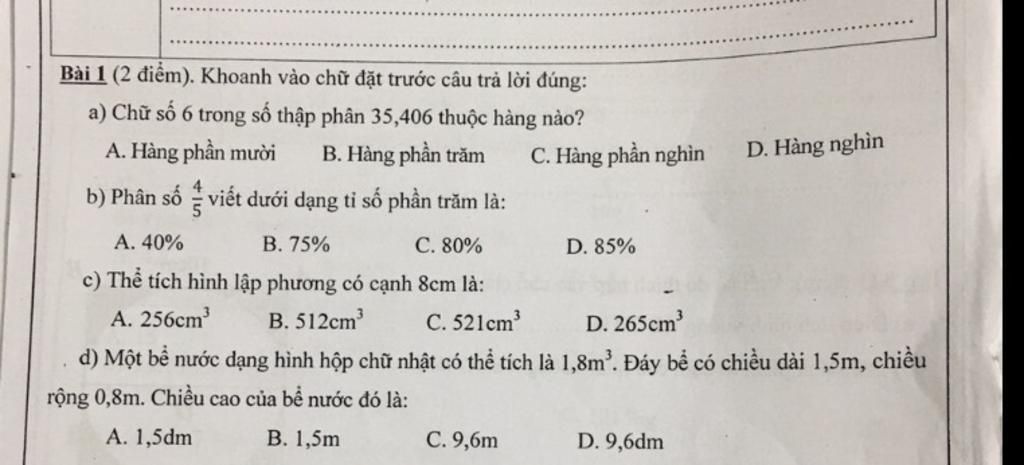 d) Chiều cao của bể nước đó là: `1,8 : (1,5 \times 0,8)=1,5(m)`