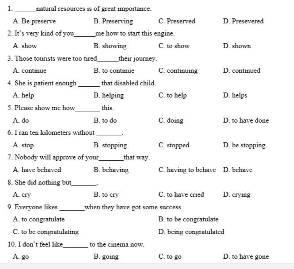 Giải thích : Vì trong câu này, danh động từ có thể làm chủ ngữ nên ta chọn preserving là phương án đúng nhất
