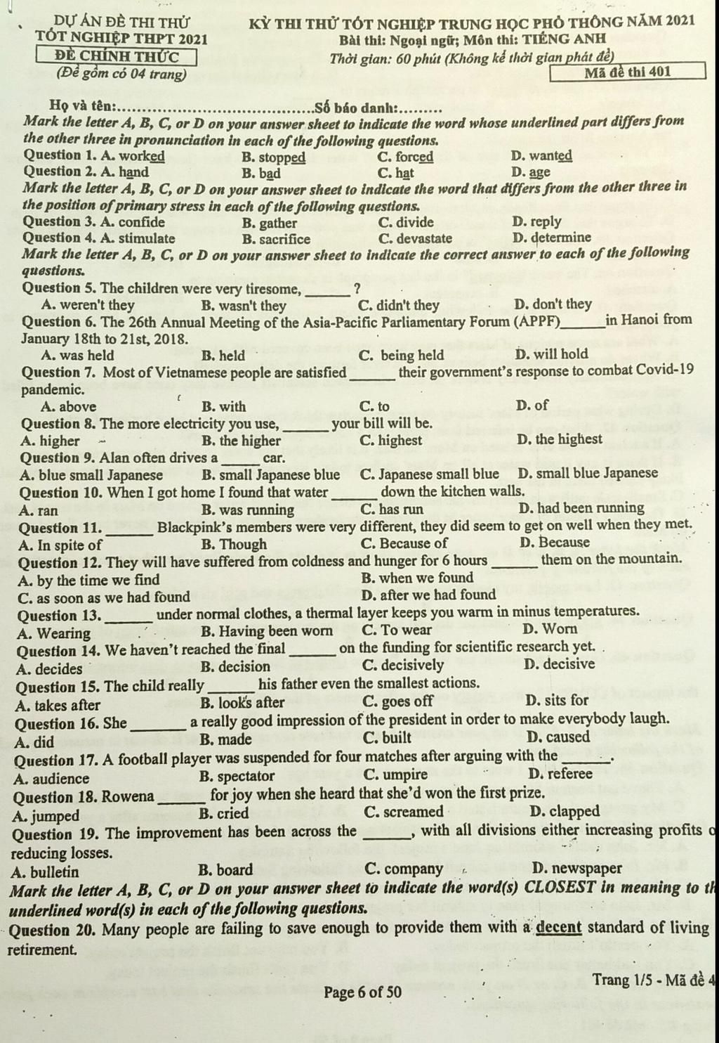 Bài thi: Ngoại ngữ; Môn thi: TIẾNG ANH