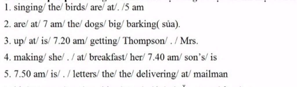 1. The birds are singing at 5 am. httd: S+ tobe+ Ving 2. The big dogs are barking at 7 am. httd: S+ tobe+ Ving 3. Mrs. Thompson is getting up at 7.20 am. httd: S+ tobe+ Ving 4. She is making her son's breakfast at 7.40 am. httd: S+ tobe+ Ving 5. The mailman is delivering the letters at 7.50 am. httd: S+ tobe+ Ving Rút gọn1. The birds are singing at 5 am. httd: S+ tobe+ Ving 2. The big dogs are barking at 7 am. httd: S+ tobe+ Ving 3. Mrs. Thompson is getting up at 7.20 am. httd: S+ tobe+ Ving 4. She is making her son's breakfast at 7.40 am. httd: S+ tobe+ Ving 5. The ma... xem thêm