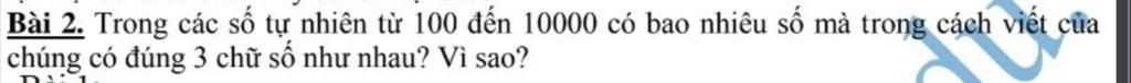 => Tất cả các số tự nhiên từ 100 đến 10000 mà trong cách viết có đúng 3 chữa số giống nhau gồm : 81 x 4= 324 số