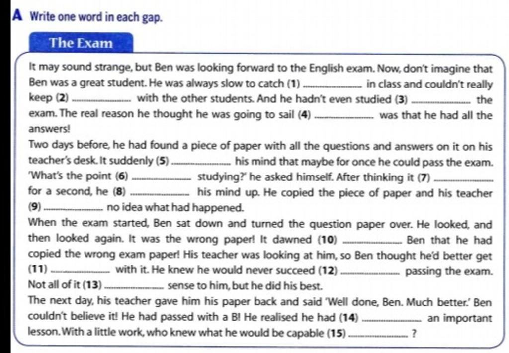 Two days before, he had found a piece of paper with all the questions and answers on it on his teacher's desk. It suddenly (5) thought his mind that maybe for once he could pass the exam. “What's the point (6) of studying?” he asked himself. After thinking it (7) over for a second, he (8) made his mind up. He copied the piece of paper and his teacher (9) had no idea what had happened.