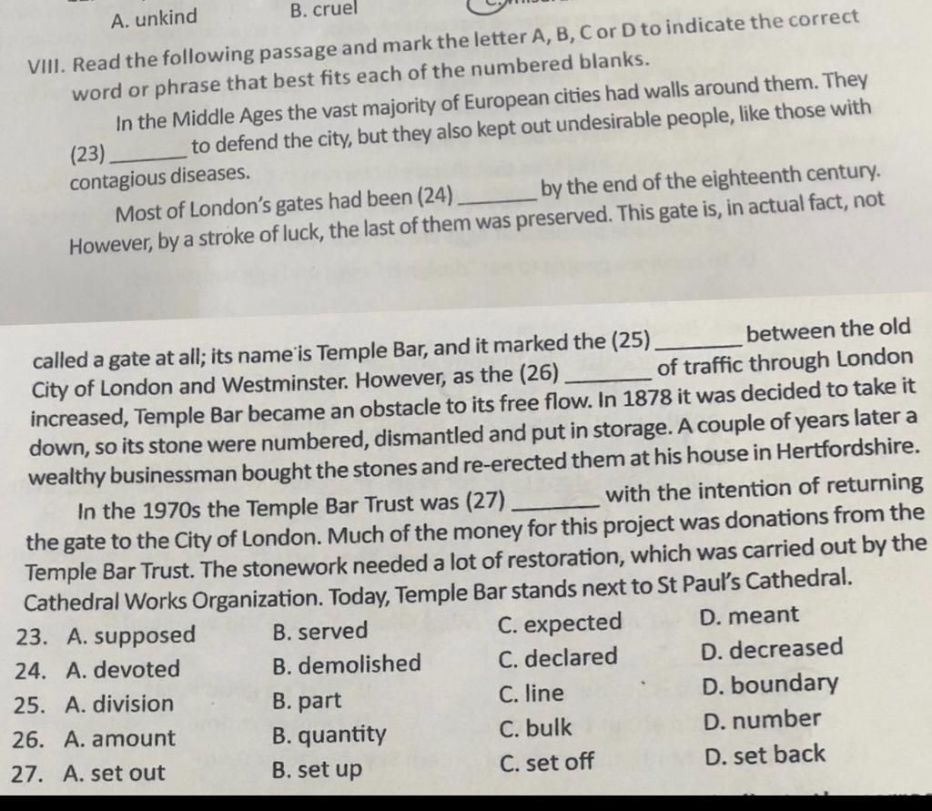 Âu đều có tường bao quanh. Họ (6) __ để bảo vệ thành phố, nhưng họ cũng ngăn chặn những kẻ không mong muốn, như những người mắc bệnh truyền nhiễm . Hầu hết các cổng của Luân Đôn đã (7) ___ vào cuối thế kỷ mười tám. Tuy nhiên, may mắn thay, chiếc cuối cùng trong số họ đã được bảo toàn. Trên thực tế, cổng này không được gọi là cổng; tên của nó là Temple Bar, và nó đánh dấu (8) __ giữa Thành phố London cũ và Westminster. Tuy nhiên, là (9) ____ lưu lượng truy cập qua London tăng lên, Temple Bar trở thành chướng ngại vật đối với dòng chảy tự do của nó. Năm 1878, người ta quyết định gỡ nó xuống, vì vậy đá của nó đã được đánh số, tháo dỡ và cất vào kho. Vài năm sau, một doanh nhân giàu có đã mua những viên đá này và lắp lại chúng tại nhà của ông ta ở Hertfordshire. Vào những năm 1970, Temple Bar Trust (10) __ với ý định trả lại cánh cổng cho Thành phố Luân Đôn. Phần lớn số tiền cho dự án này là tiền quyên góp từ Temple Bar Trust. Công việc bằng đá cần được trùng tu rất nhiều, được thực hiện bởi Tổ chức Công trình Nhà thờ. Ngày nay, Temple Bar nằm cạnh Nhà thờ St Paul.
