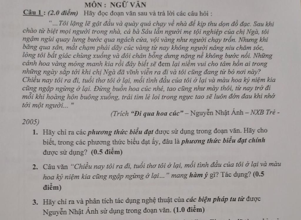 -Cácphương thức biểu đạt được sử dụng trong đoạn văn : Tự sự, biểu cảm.