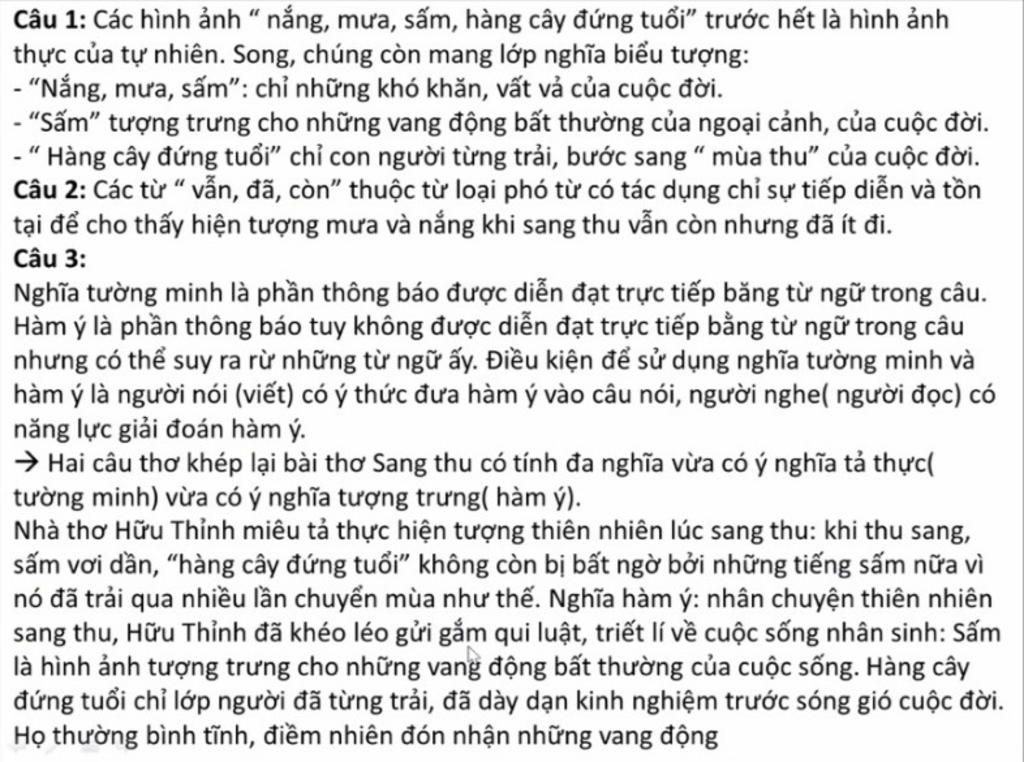 Hàm ý trong hai câu thơ cuối đó là những người từng trải, trưởng thành trong cuộc sống sẽ có sức mạnh bền bỉ tốt hơn để đối đầu với những khó khăn và thử thách trong cuộc sống của mình. Hình ảnh của những hàng cây đứng tuổi là hình ảnh ẩn dụ của những người trưởng thành và "sấm" là hình ảnh ẩn dụ của những khó khăn trong cuộc sống. Hình ảnh này hàm ý cho sự trưởng thành và mạnh mẽ theo năm tháng của con người khi đối mặt với những khó khăn. Sự bình tâm và nhẹ nhàng ấy cũng giống như sự chuyển sang mùa thu của thiên nhiên. Chính vì thế hình ảnh ẩn dụ này cho thấy sự tinh tế và tài hoa của nhà thơ Hữu Thỉnh.