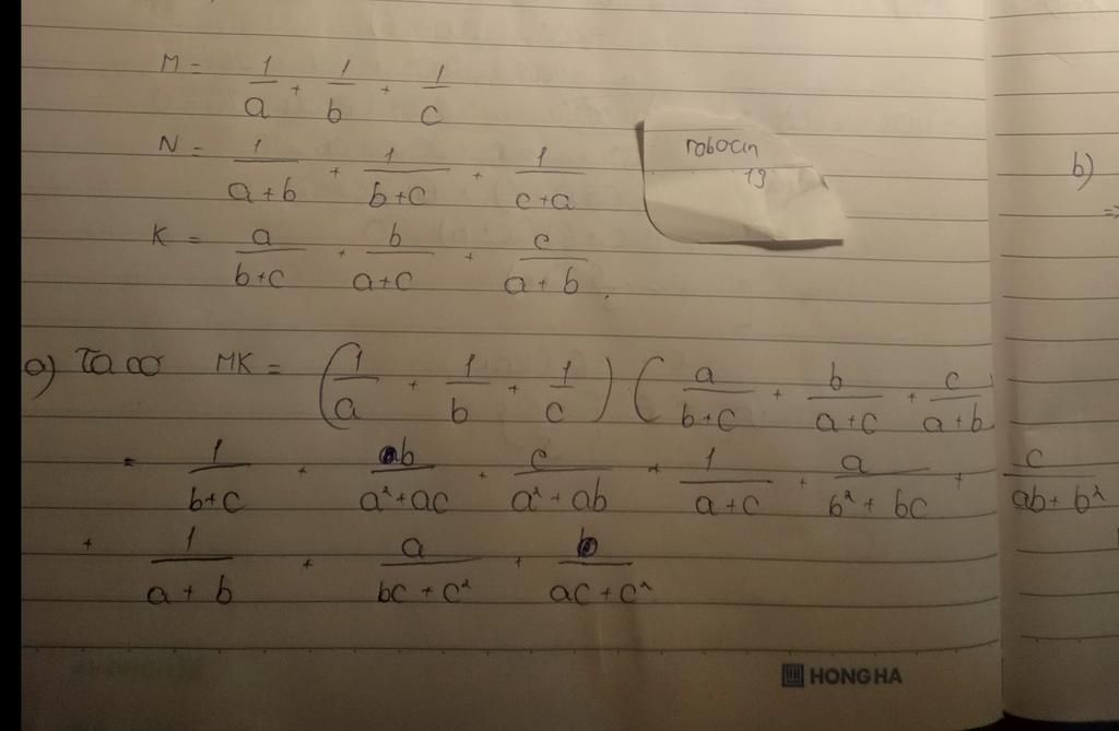 a, Ta có: $MK=(\frac{1}{a}+\frac{1}{b}+\frac{1}{c})(\frac{a}{b+c}+\frac{b}{a+c}+\frac{c}{a+b})$