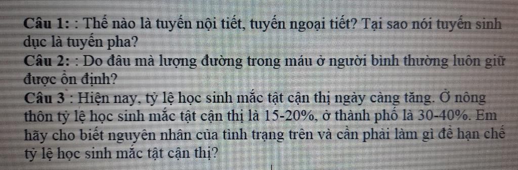 $\textit{Câu 1}$ $\textit{Tuyến ngoại tiết: Sản phẩm (chất tiết) theo ống dẫn đến các cơ quan xác định hoặc đưa ra ngoài.Tuyến nội tiết: Sản phẩm là các chất tiết (hoocmôn) tiết ra được ngấm thấm thẳng vào máu đưa đến cơ quan đích}$ $\textit{Tuyến sinh dục là tuyến pha vì nó đồng thời thực hiện 2 chức năng đó là :sản sinh giao tử và tiết hoocmon gây biến đổi đặc tính sinh dục đặc trưng ở tuổi dậy thì}$ $\textit{Câu 2}$ $\textit{Lượng đường trong máu giữ được ổn định là do sự phối hợp hoạt động của tế bào α và tế bào β của đảo tụy trong tuyến tụy}$ $\textit{Câu 3}$ $\textit{Cận thị : mắt chỉ có khả năng nhìn gần Nguyên nhân : có thể là khi sinh ra cầu mắt dài hay trong đời sống không giữ đúng khoảng cách làm cho thể thuỷ tinh luôn phồng , lâu dần thì mất khả năng dãn}$ $\textit{Nguyên nhân:Do học sinh sử dụng các thiết bị điện tử như TV,điện thoại,máy tính nhiều và học tập ở môi trường thiếu ánh sáng.ngồi học không đúng tư thế cũng như chưa có ý thức giữ gìn đôi mắt}$ $\textit{Biện pháp:Tuyên truyền,mở các buổi ngoại khoá về bảo vệ mắt,giúp cho các em có thêm hiểu biết và có ý thức bảo vệ đôi mắt của mình }$