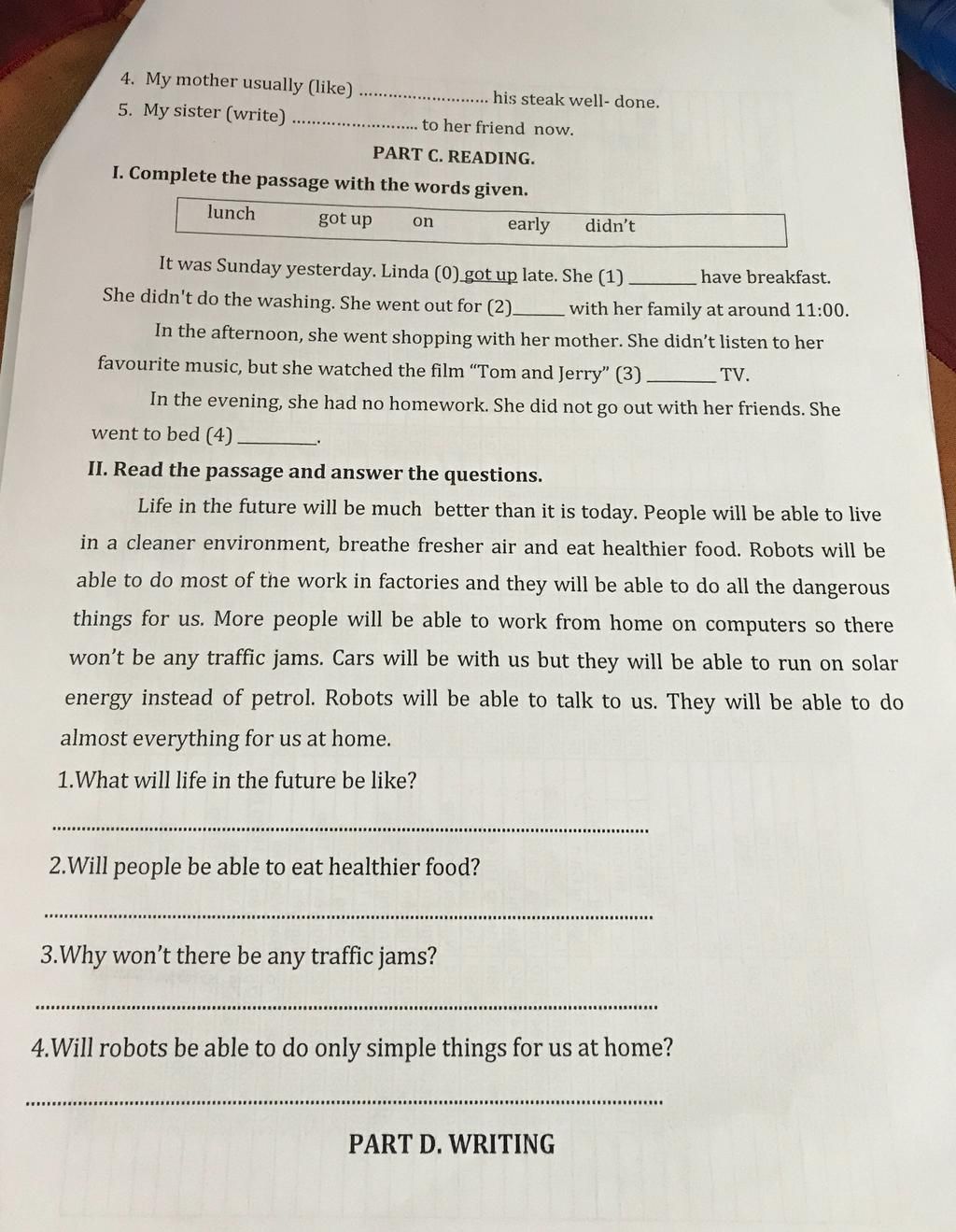 It was Sunday yesterday. Linda (example) got up. She (1) ……didn't……… have breakfast. She didn’t do the washing. She went out for (2) ……lunch…… with her family at around 11 am. In the afternoon, she went shopping with (3) ………her………mother. She didn’t listen to her favorite music, but she watched the film “Tom and Jerry” (4) ………on………TV. In the evening, she had no homework. She didn’t go out with her friends. She went to bed (5) ……early……….
