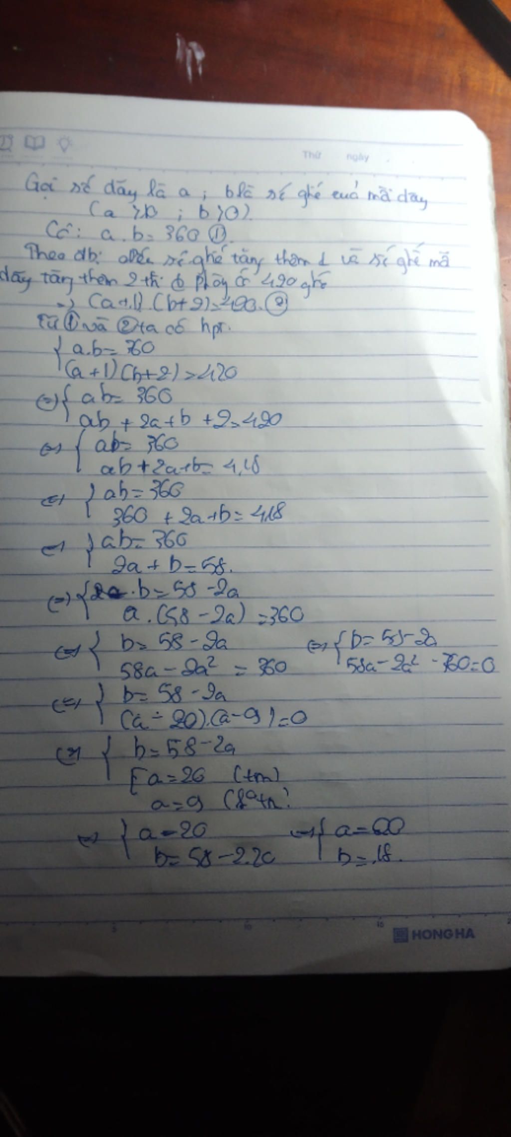 Vậy trong phòng có `20` dãy ghế và mỗi dãy có `18` ghế.