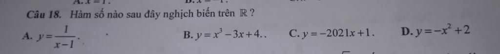 Hàm $C$ quen thuộc nhất và dễ xét đơn điệu nhất: hàm bậc nhất. Hàm bậc nhất $y=ax+b (a\ne 0)$ có $a<0$ thì nghịch biến trên $\mathbb{R}$.