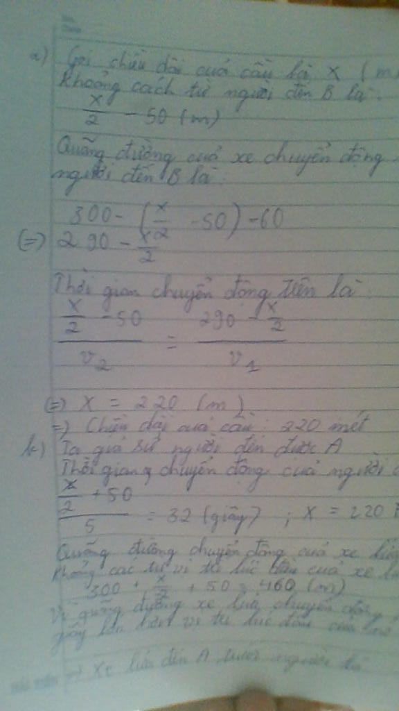 b, Khi phát hiện xe lửa thì người này cách A : $S_{AC}=\frac{S_{AB}}{2}+50=220m$