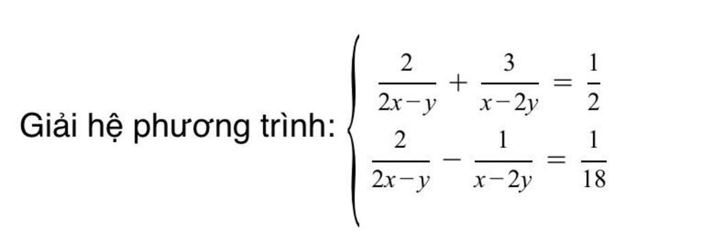 `{(2/(2x-y)+3/(x-2y)=1/2),(2/(2x-y)-1/(x-2y)=1/18):}` `(x ne 2y;y ne 2x)`