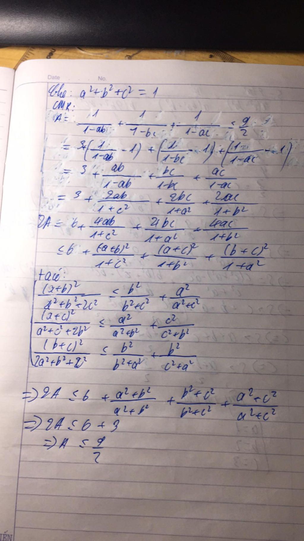 Vậy `1/{1-ab}+1/{1-bc}+1/{1-ca}\le 9/ 2`
