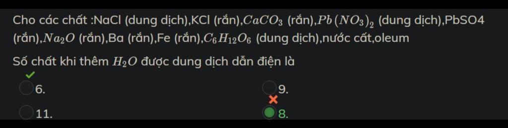 Đáp án:+ chất dẫn điện là những dung dịch hoặc chất rắn ...- đối với chất lỏng phải là những dung dịch có khả năng phân li ra ion (không xét đến trường hợp hòa tan vào nước)- đối với chất rắn sẽ là kim loại ...=> ý a sẽ gồm có NaCl (dung dịch), Pb(NO3)2 (dung dịch), Ba (rắn), Fe (rắn)+ chất khi thêm nước tạo dung dịch dẫn điện thì sẽ thỏa mãn điều kiện là phân li ra ion (trong sách giáo khoa)=> ý b sẽ gồm NaCl (dung dịch), KCl (rắn), Pb(NO3)2 (dung dịch), Na2O (rắn), Ba (rắn), oleum (H2SO4.nSO3)ad không giỏi văn lắm nên diễn đạt có phần hơi lủng củng nên các mem không hiểu chỗ nào thì cứ hỏi nhé