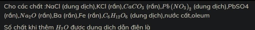$NaCl, KCl, Pb(NO_3)_2, Na_2O, Ba$, oleum thêm nước được dd dẫn điện (xảy ra sự hoà tan vật lí hoặc phản ứng hoá học).