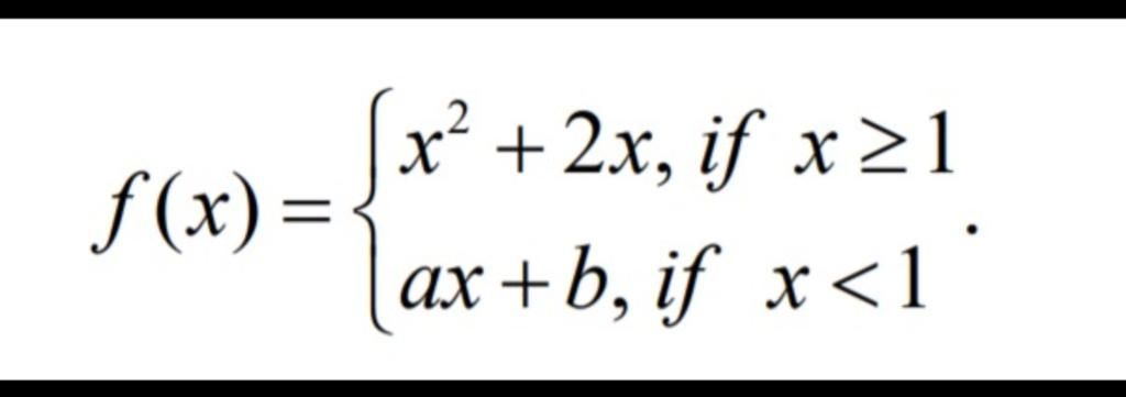 $\left\{\begin{array}{l} \displaystyle\lim_{x \to 1^+} f(x)=\displaystyle\lim_{x \to 1^-} f(x)\\f'(1^+)=f'(1^-)\end{array} \right.\\ \Leftrightarrow \left\{\begin{array}{l} 3=a+b\\4=a\end{array} \right.\\ \Leftrightarrow \left\{\begin{array}{l} a=4\\b=-1\end{array} \right.$