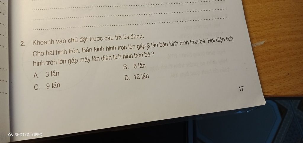 Vì bán kính hình tròn lớn gấp $3$ lần bán kính hình tròn bé nên diện tích hình tròn lớn gấp $3\times3=9$ diện tích hình tròn bé
