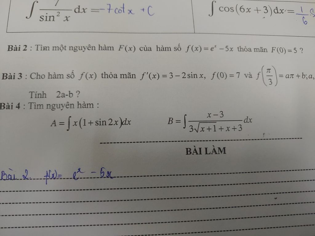 Bài 3 : Cho hàm số f(x) thỏa mãn f'(x) = 3- 2 sin x, f(0) = 7 và ƒ(pi/3)= api +b; a, Tính 2a-b ?