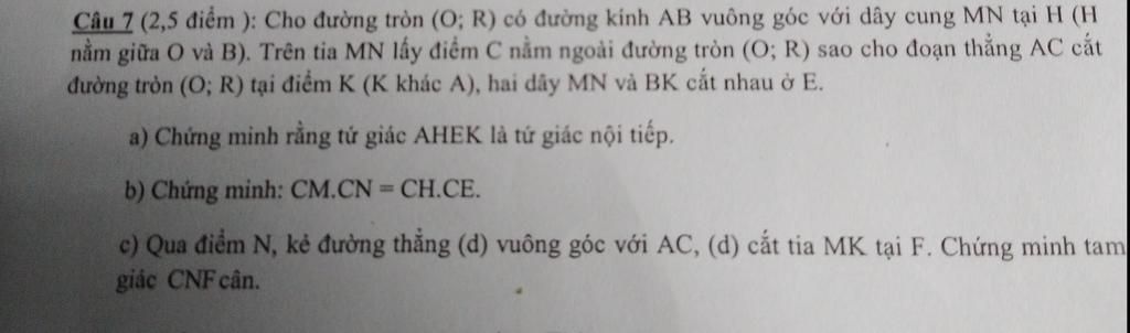 Câu 7 (2,5 điểm ): Cho đưong tròn (O; R) có đưong kinh AB vuông góc với dây cung MN tại H (H