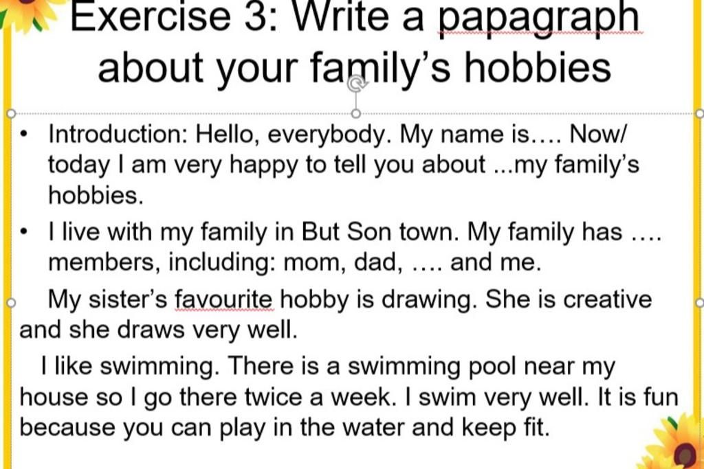 Hello everybody, my name is .......... Today, I am very happy to tell you about my family's hobbies. I live with my family in But Son town. My family has 4 members, including mom, dad, sister and me. My mom's favourite hobby is cooking. She love making delicious meals for my family. She often tries new recipes. All dishes she cooks are very tasty. My dad doesn't like cooking. He enjoy watching TV. He always watches TV after dinner. He loves watching football matches and The news. My sister's favourite hobby is drawing. She is creative and she draws very well. I love all of her pictures, they're very beautiful and colorful. I like swimming. There's a swimming pool near my house, so I go there twice a week. I swim very well. I find swimming fun and helpful, because I can play in the water and keep fit. It makes me feel relax after a busy day at school. All of people have hobbies, and they're different. If you can, tell me about your and your family's hobbies. Thanks a lot for your attention.