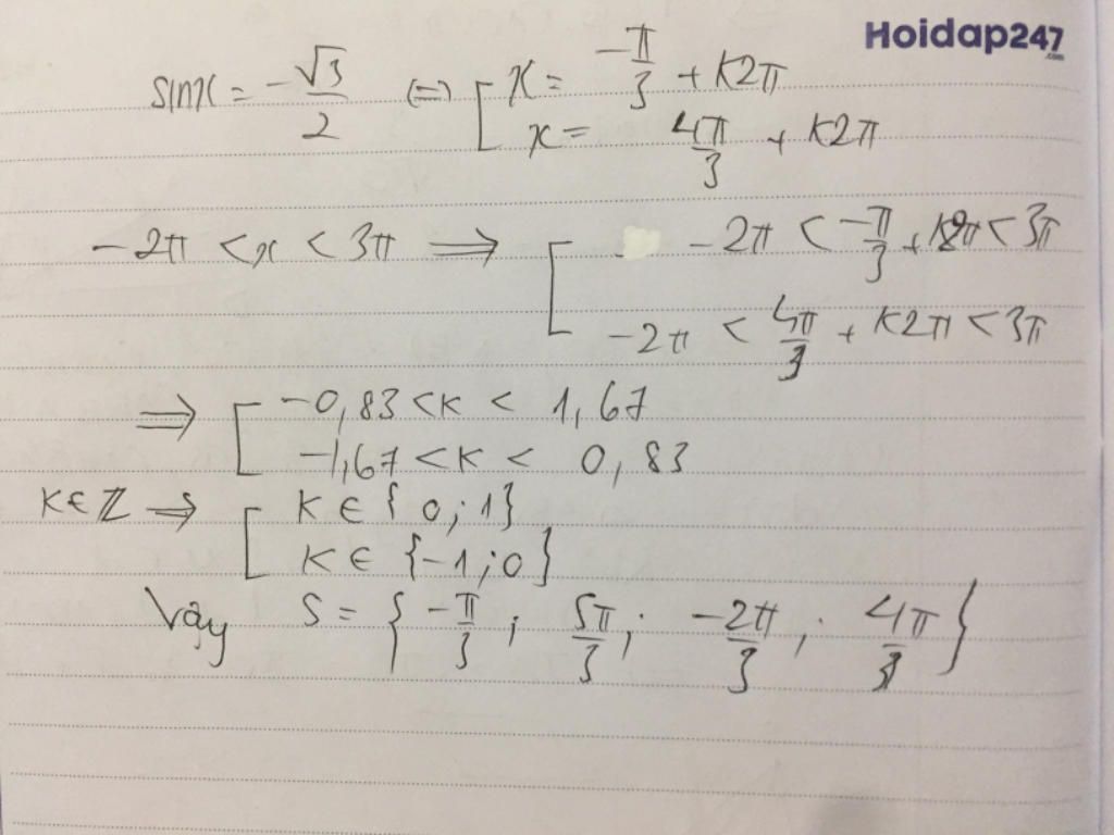 $sinx=\dfrac{-\sqrt{3}}{2}\\\Leftrightarrow \left[\begin{matrix}x=\dfrac{-π}{3}+k2π\\x=\dfrac{4π}{3}+k2π\end{matrix}\right.\ (k\in Z)$