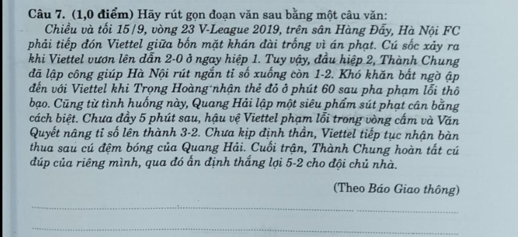 - Rút gọn : Chiều tối ngày 15/9 , có một trận đấu V.League giữa Hà Nội FC và Viettel trên sân Hàng Đẫy với những phút giây hồi hộp , gay cấn , những pha bóng điêu luyện cùng sự kiên cường , Hà Nội FC đã giành chiến thắng 5 - 2 chung cuộc .