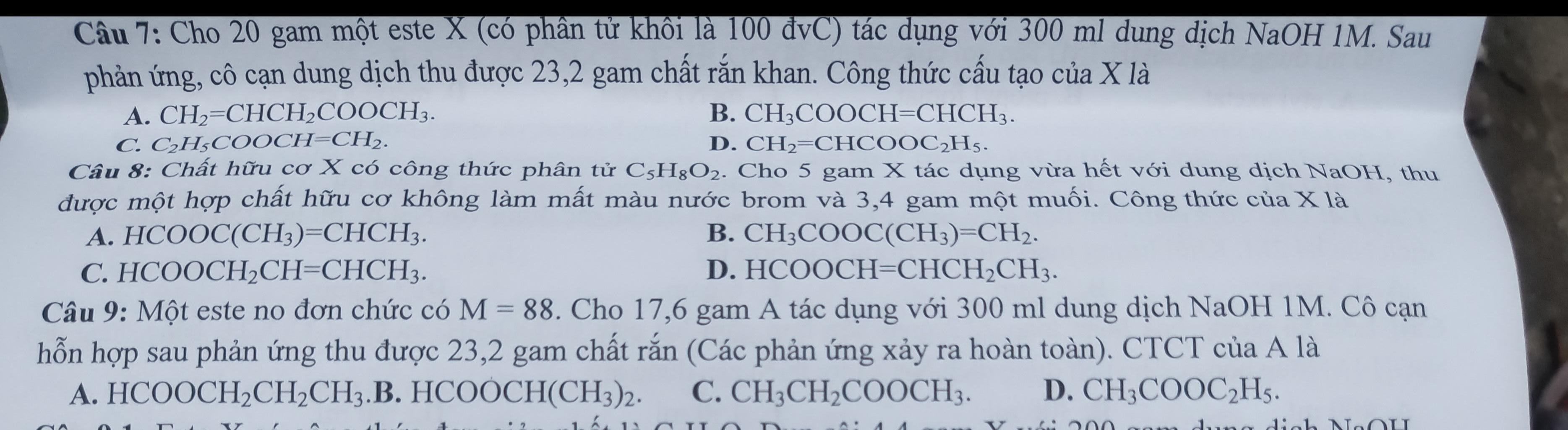 Câu 7: Cho 20 gam một este X (có phân tử khôi là 100 đvC) tác dụng với 300 ml dung dịch NaOH 1M. Sau