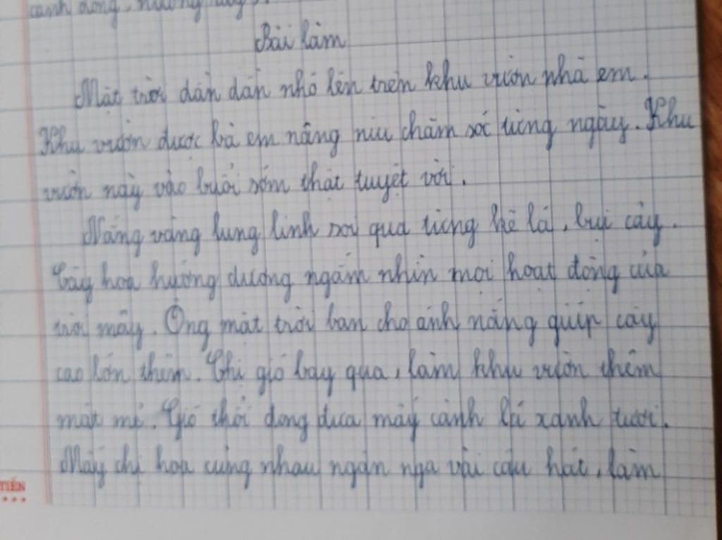 Tôi ra vườn từ khi trời còn chưa lửng dạ. Buổi sáng sớm, không khí trong lành và mát mẻ. Cả khu vườn như được bao bọc trong tấm màn hơi sương sớm. Bầu trời xám xịt, chẳng thấy ông mặt trời đâu cả, chỉ thấy những vì sao còn lười biếng đang phát sáng lấp lánh trên bầu trời mà không chịu thức dậy. Phía đằng Đông, một quả bóng lớn đang từ từ thoát khỏi đường chân trời rộng lớn. Quanh nó là những tia nắng vàng tươi, nhẹ nhàng tỏa xuống trần gian, chiếu lên câu lá, hoa cỏ trong vườn nhà. Những đám mây trắng tinh như những chiếc kẹo bông gòn, bầu trời xanh thẳm, sắc xanh, đỏ vàng của cây lá trong vườn hòa quyện với nhau tạo nên một khung cảnh xinh đẹp, huyền ảo tựa như đang ở sứ sở thần tiên.