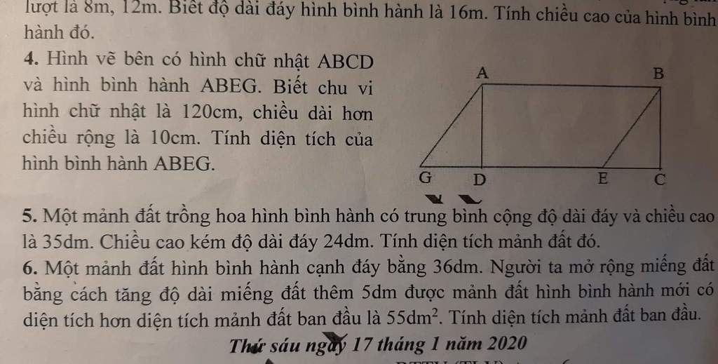 Hình bình hành ABEG có đáy là AB=EG=35 cm, chiều cao là AD=25 cm