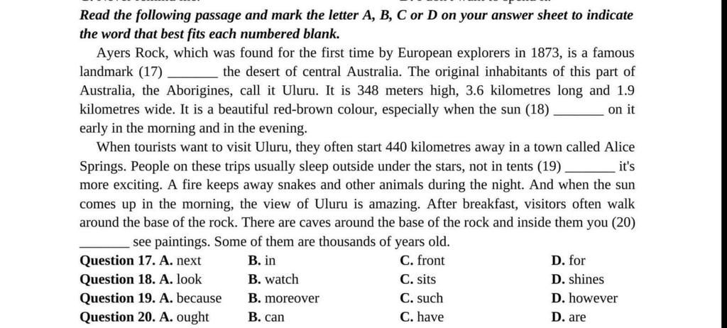 ⇒Tạm dịch: Ayers Rock, được các nhà thám hiểm châu Âu tìm thấy lần đầu tiên vào năm 1873, là một thắng cảnh nổi tiếng ở sa mạc miền trung nước Úc.