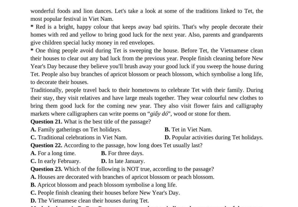 -- Thông tin :People finish cleaning before New Year's Day because they believe you'll brush away your good luck if you sweep the house during Tet.