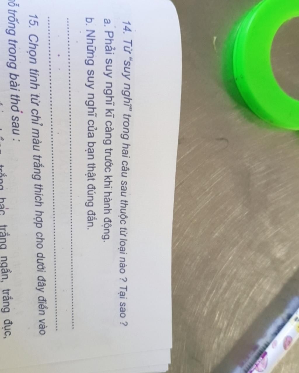 $→$ Từ "suy nghĩ" rong câu a là "động từ". Vì từ "suy nghĩ" ở đây là chỉ một hành động "cần suy nghĩa" trước khi nói. → Nó là "động từ"