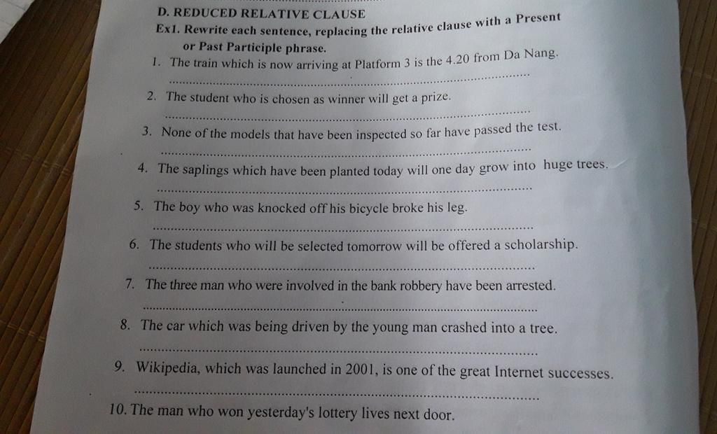 Ex1. Rewrite each sentence, replacing the relative clause w or Past Participle phrase.