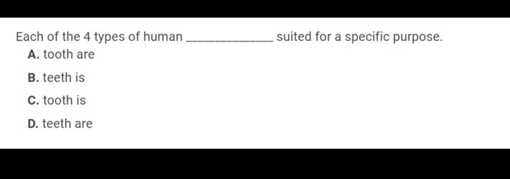 *Ta có: Human teeth - răng con người(nên dùng số nhiều), còn is là động từ của chủ ngữ "each of the 4 types of human", each mới quyết định chia động từ số ít hay số nhiều.