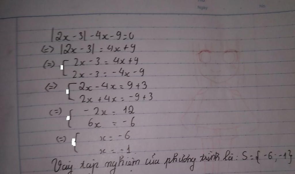\(⇔ \left[ \begin{array}{l}2x-3=4x+9\\2x-3=-4x-9\end{array} \right.\)