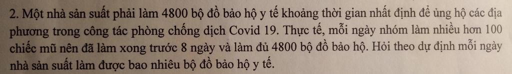 Gọi số bộ đồ bảo hộ y tế theo dự định mỗi ngày nhà sản xuất làm được là `x` ( bộ, x ∈ N* )