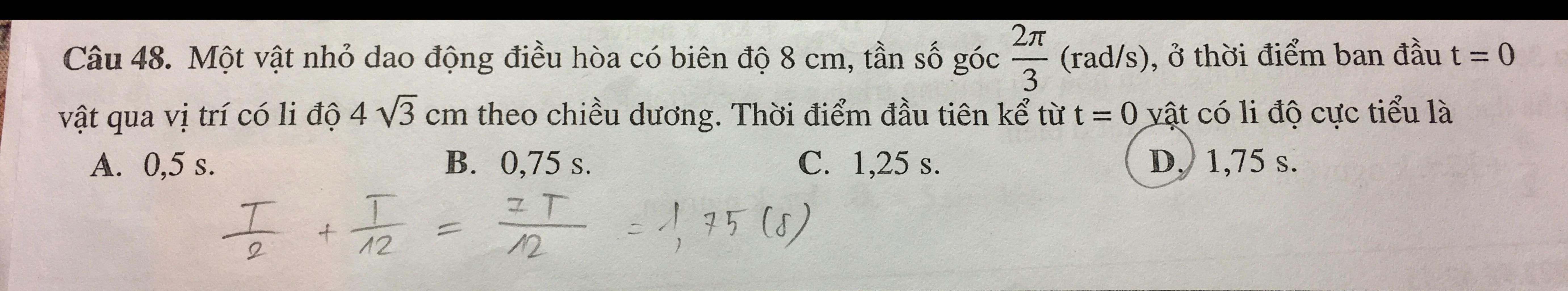 \(t = \dfrac{\alpha }{\omega } = \dfrac{{\dfrac{7}{6}\pi }}{{\dfrac{2}{3}\pi }} = 1,75s\)