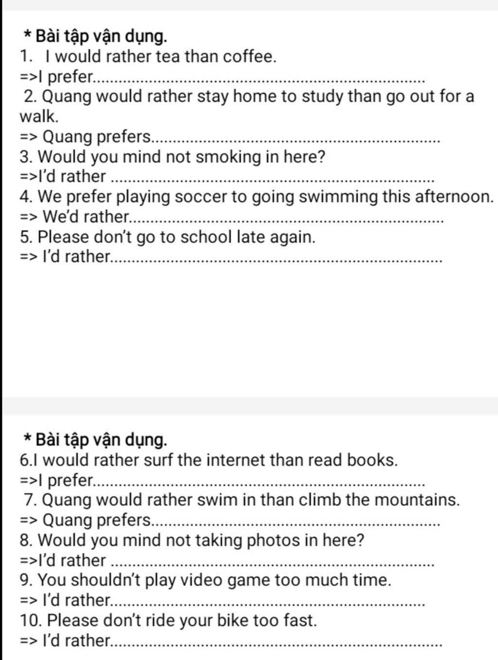 1. I prefer tea to coffee. (prefer...to : thích gì hơn)