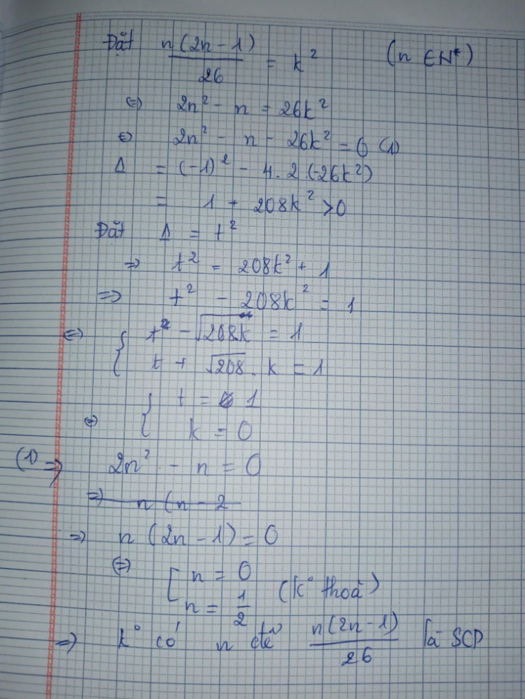 Vậy không tồn tại n nguyên dương sao cho `{n(2n-1)}/26` là số chính phương