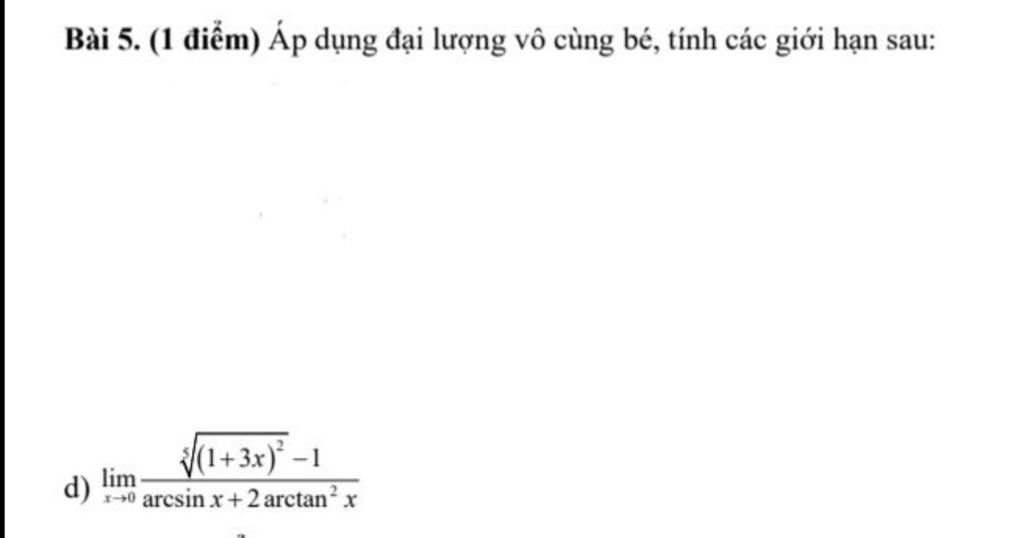 \quad \lim\limits_{x\to 0}\dfrac{\sqrt[5]{(1 + 3x)^2} - 1}{\arcsin x + 2\arctan^2x}\\