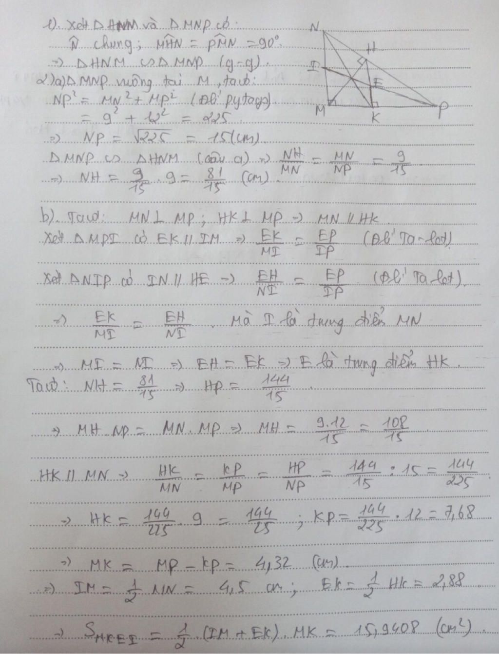 b) Gọi I là trung điểm của MN, kẻ HK vuông góc với MP tại K. Gọi E là giao điểm của KH