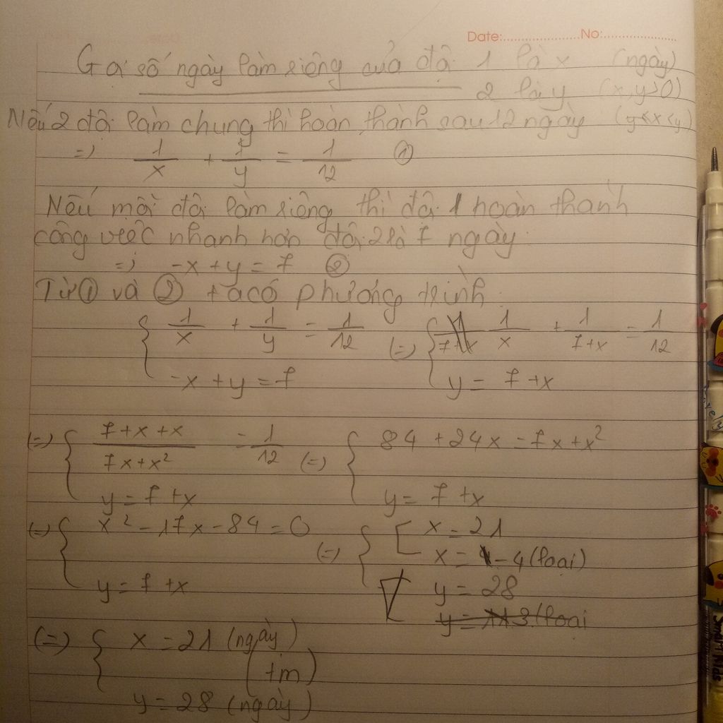 Vậy nếu làm riêng thì đội 1 hoàn thành công việc trong 21 ngày, đội 2 hoàn thành công việc trong 28 ngày.