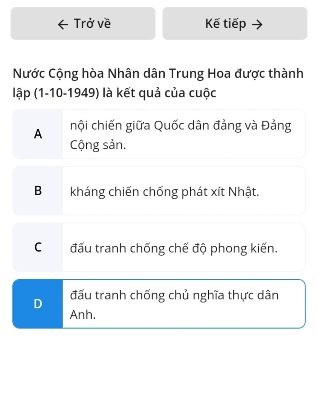 Giải thích: Nước Cộng Hoà Nhân Dân Trung Hoa được thành lập (1-10-1949) là kết quả của cuộc nội chiến giữa Quốc dân đảng và Đảng Cộng sản.