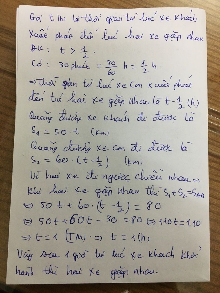Vậy sau 0,5+0,5= 1 giờ kể từ lúc xe khách khởi hành, 2 xe gặp nhau