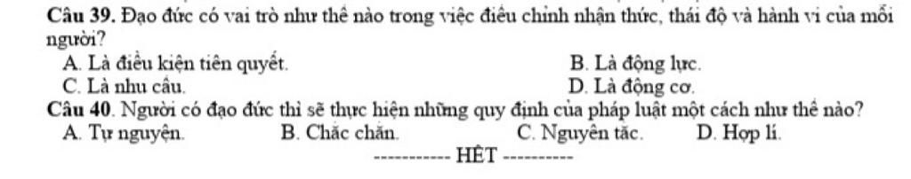 39: Đạo đức là những phẩm chất bền vững của mỗi cá nhân, là động lực điều chỉnh nhận thức, thái độ và hành vi của mỗi người, trong đó có hành vi pháp luật