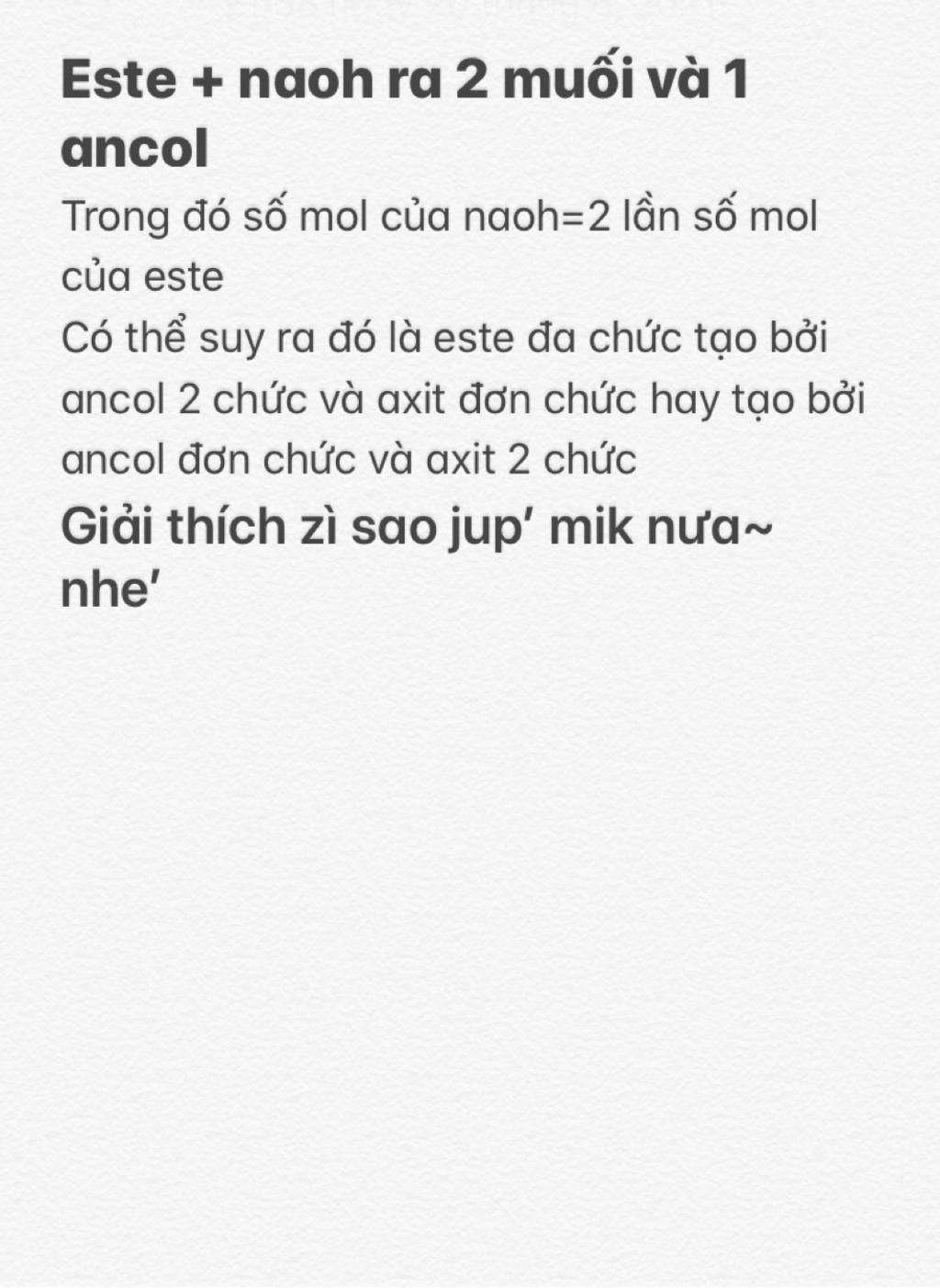 (1) este đa chức bởi ancol đa chức và hai axit đơn chức (do nếu axit đa chức thì chỉ tạo 1 muối)