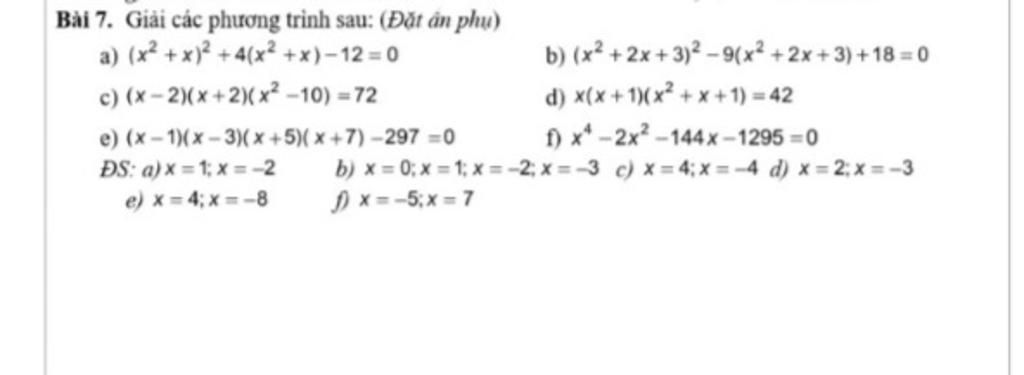 Bài 7. Giải các phương trình sau: (Đặt ân phụ)