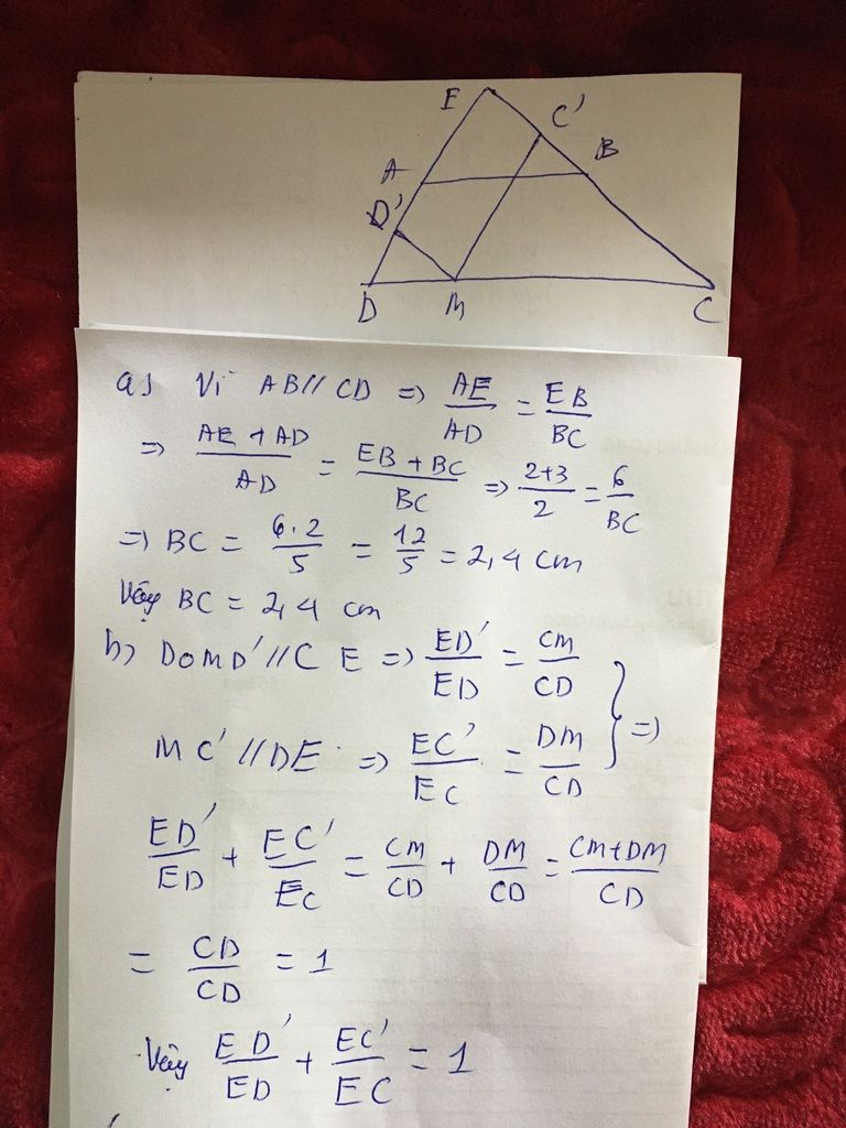 -Từ (1) và (2) ⇒$\frac{DE'}{ED}+$$\frac{EC'}{ED}=$$\frac{MD}{DC}+$$\frac{DM}{DC}=$$\frac{DC}{DC}=1$⇒đpcm