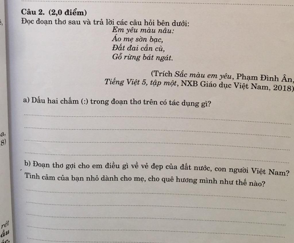 a)Dấu hai chấm trong đoạn thơ trên có tác dụng báo hiệu bộ phận đứng sau nó nói là lời giải thích cho bộ phận đứng trước.(ở đây là nói những hình ảnh có màu nâu , giải thích cho bộ phận đứng trước là vì sao em yêu màu nâu)